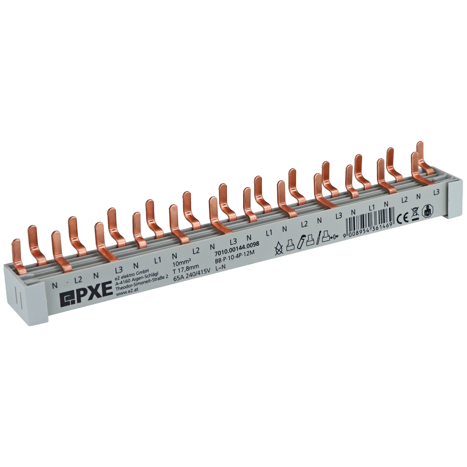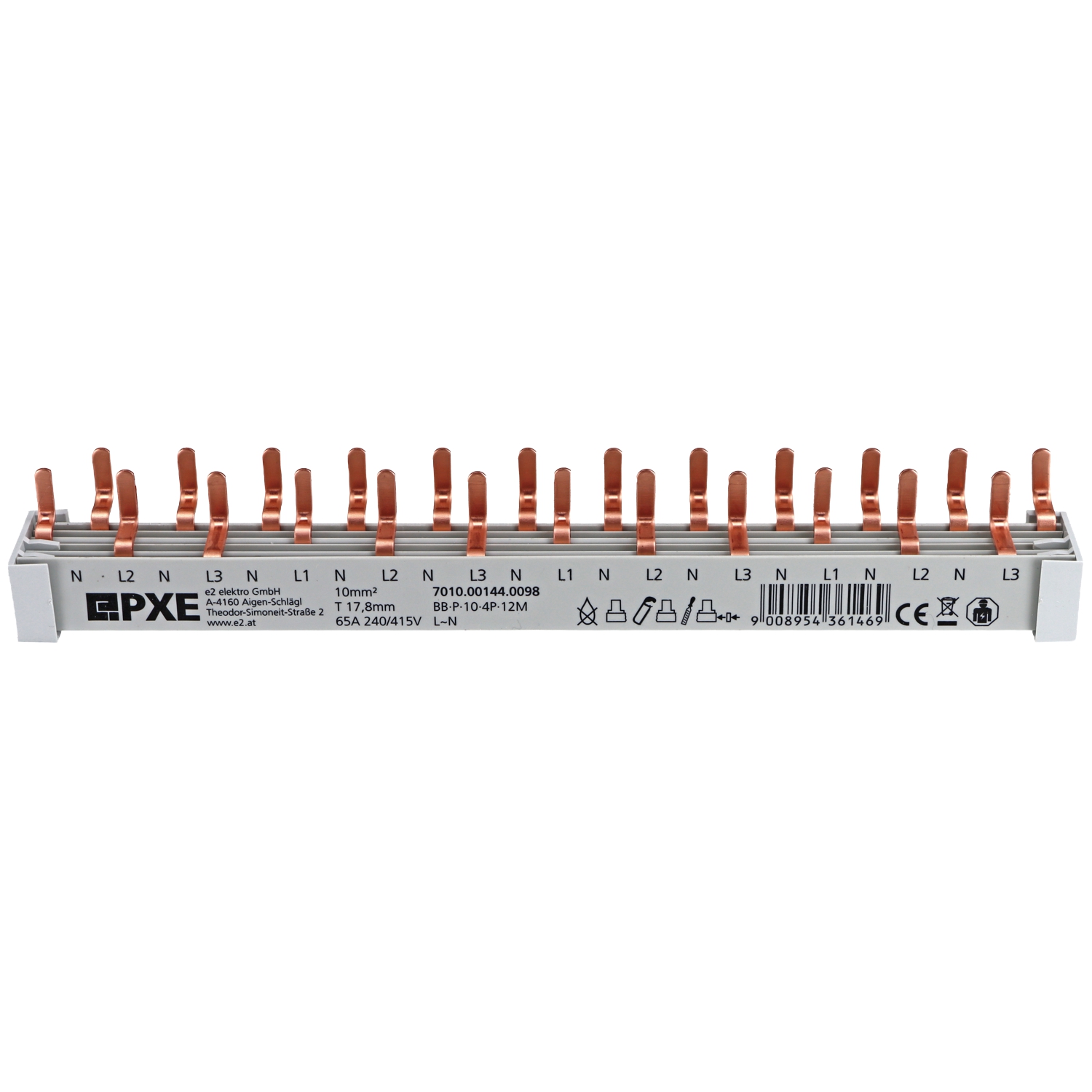 Vorkonfektionierte Stift-Sammelschiene inkl. Endkappen für Leitungsschutzschalter 1+N mit 1TE, 4polig / 12TE (L1/N - L2/N - L3/N - L1/N - L2/N - L3/N - L1/N - L2/N - L3/N - L1/N - L2/N - L3/N), Querschnitt: 10mm², passend zum PXE und ETI Programm