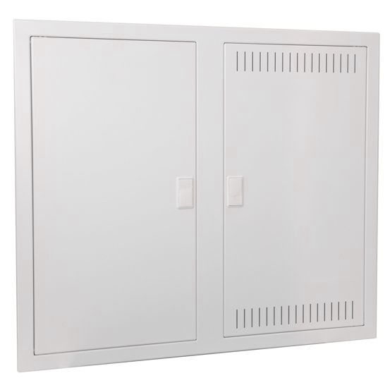 Unterputz-Verteiler-Kombination 3-reihig, Kombination aus Strom-Kleinverteiler und Mediaverteiler in einem Gehäuse, Aufbau: Linke Seite 3 Reihen 36(42)TE Stromverteiler + Rechte Seite 3 Reihen Mediaverteiler mit Montagplatte gelocht, inkl. Hohlwand-Montagesatz, inkl. vormontierter SCHUKO-Steckdose 2-fach, Mauerwannen aus Kunststoff - zusammenhängend, 2 getrennte Türen+Rahmen aus Stahlblech (Rechte Tür perforiert), Nischenmaß: hxbxt 549x660x87mm, Blendrahmen: hxb 592x692mm, Glühdrahttest: 850°C nach IEC 60670-24, halogenfrei;