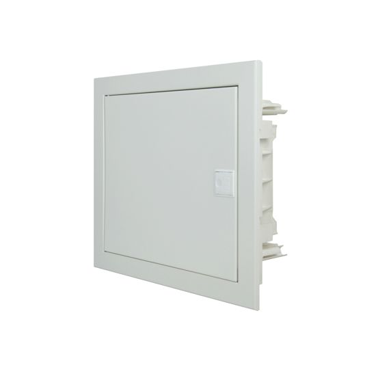 Unterputz-Verteiler zur Montage in Wänden aller Art, bestehend aus Unterteil (Mauerwanne) und Oberteil, Mauerwanne aus Kunststoff, Tür+Rahmen aus Stahlblech RAL 9003, inkl. Hohlwand-Montagesatz, Glühdrahttest: 850°C nach IEC 60670-24, halogenfrei, IP40;