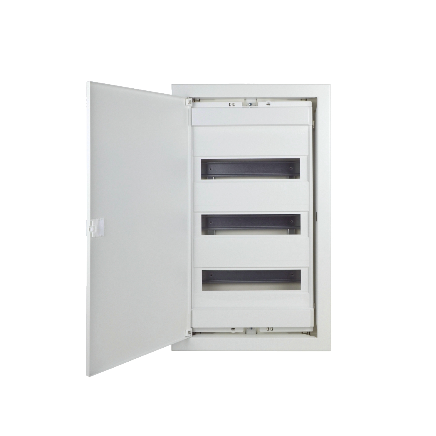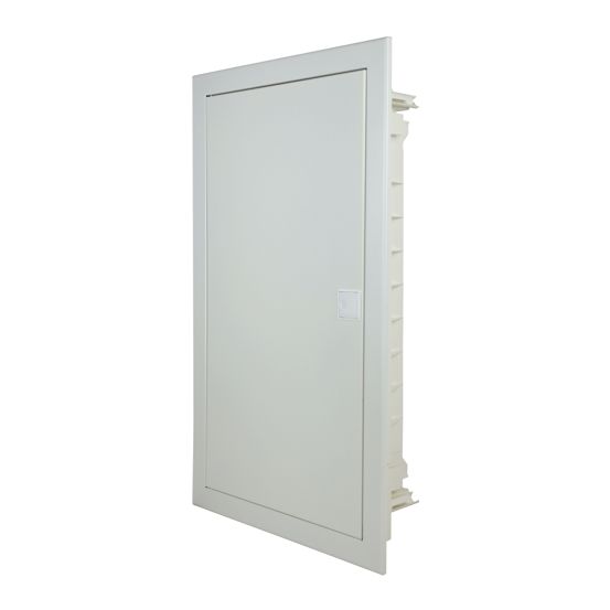 Unterputz-Verteiler zur Montage in Wänden aller Art, bestehend aus Unterteil (Mauerwanne) und Oberteil, Mauerwanne aus Kunststoff, Tür+Rahmen aus Stahlblech, inkl. Hohlwand-Montagesatz, Glühdrahttest: 850°C nach IEC 60670-24, halogenfrei, IP40;