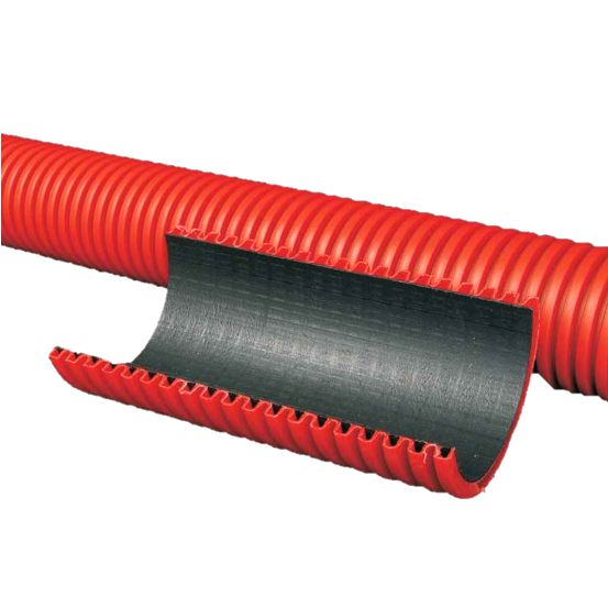 Doppelwandiges Kabelschutzrohr aus Polyethylen, mit Zugschnur 1mm² aus Polypropylen, hohe chemische Beständigkeit gegen Säuren und Basen, Verwendung als Schutz- und Leerrohr für den universellen Einsatz im Erdreich, Druckfestigkeit >450N, Temperaturbereich: -5° bis +60°, Schlagfestigkeit: 2 Joule, außen gewellt - innen glatt, Farbe rot, innen schwarz, halogenfrei;
