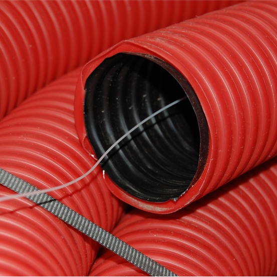 Doppelwandiges Kabelschutzrohr aus Polyethylen, mit Zugschnur 1mm² aus Polypropylen, hohe chemische Beständigkeit gegen Säuren und Basen, Verwendung als Schutz- und Leerrohr für den universellen Einsatz im Erdreich, Druckfestigkeit >450N, Temperaturbereich: -5° bis +60°, Schlagfestigkeit: 2 Joule, außen gewellt - innen glatt, Farbe rot, innen schwarz, halogenfrei;