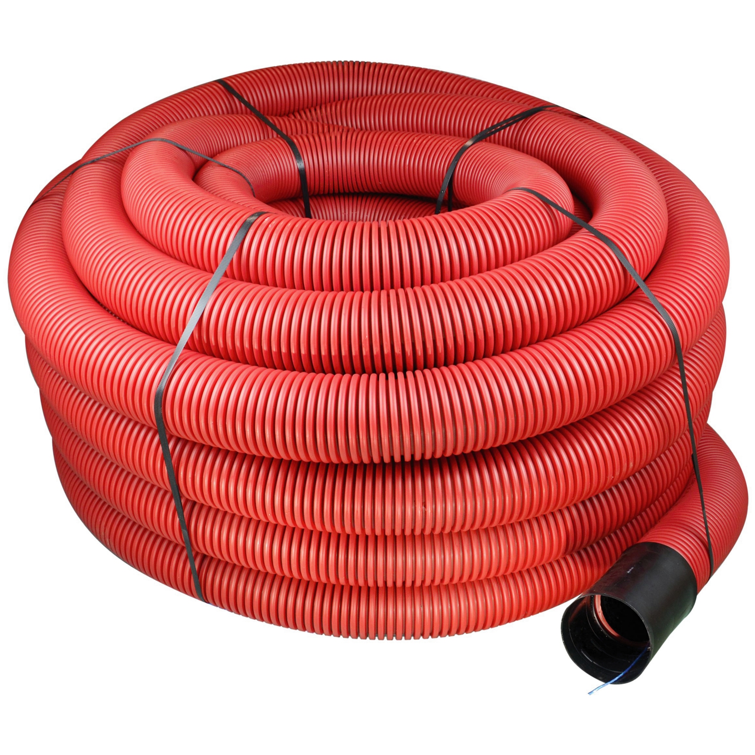 Doppelwandiges Kabelschutzrohr aus Polyethylen, mit Zugschnur 1mm² aus Polypropylen, hohe chemische Beständigkeit gegen Säuren und Basen, Verwendung als Schutz- und Leerrohr für den universellen Einsatz im Erdreich, Druckfestigkeit >450N, Temperaturbereich: -5° bis +60°, Schlagfestigkeit: 2 Joule, außen gewellt - innen glatt, Farbe rot, innen schwarz, halogenfrei;