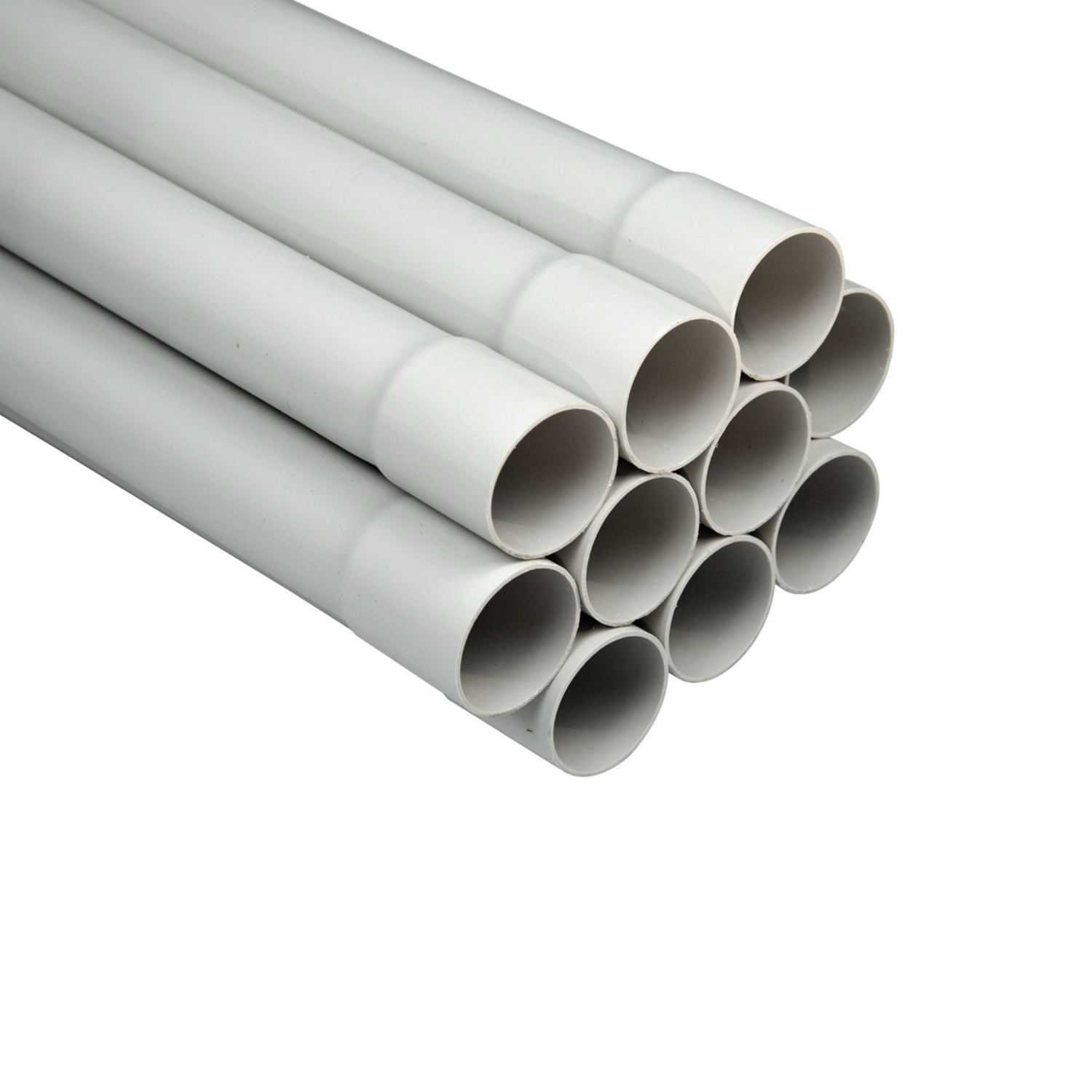 E-Rohr starr, aus PVC, einseitig gemufft, Kennzeichen: EN2221, Temperaturbereich: -5°C bis +60°C, Scheiteldruckfestigkeit: >320N auf 5cm, Schlagfestigkeit: 1 Joule bei -5°C, nicht flammausbreitend, foliert;