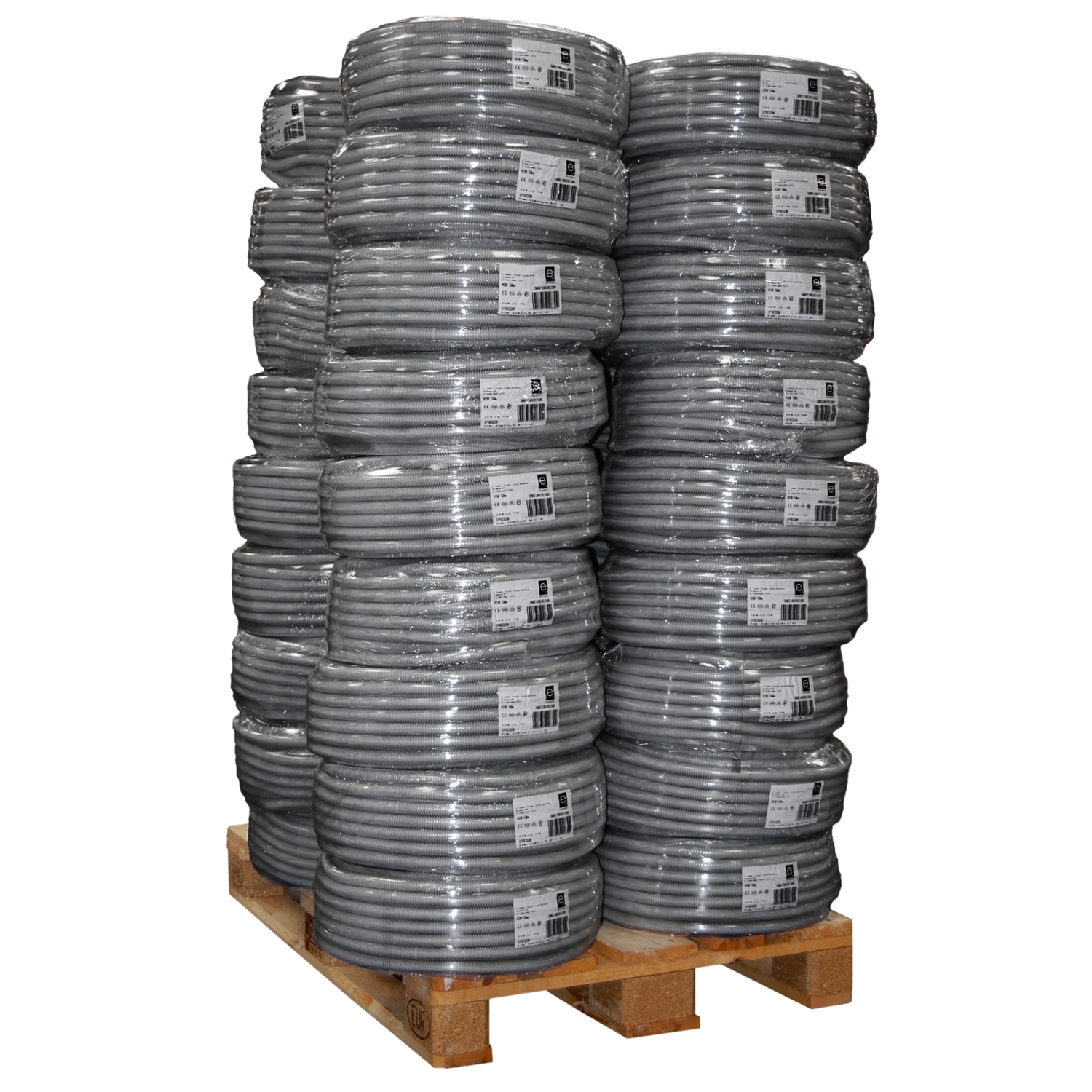 E-Rohr flexibel aus PVC, Kennzeichen: EN33412, Temperaturbereich: -25°C bis +60°C, Scheiteldruckfestigkeit: >750N auf 5cm bei +23°C, Schlagfestigkeit: 2Joule bei -25°C, nicht flammausbreitend, foliert;