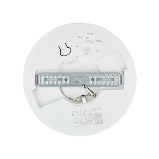 LED Panel mit flexiblem Montagebügel zur Anbau- oder Einbaumontage mit Klappfedern in Ausschnitt Ø65-155mm, weißer Kunststoffrahmen, Gehäuse aus Polypropylen, Abdeckung opal, Lichtleistung 3-stufig einstellbar 12W/9W/6W, 1600lm bei 12W, Lichtfarbe 3000/4000/6500K an Gehäuserückseite umschaltbar, inkl. LED Treiber, durchschnittliche LED Lebensdauer 25.000h, CRI>80, Abstrahlwinkel 117°, nicht dimmbar, Schutzart IP20, SK II, 220-240V 50Hz, Temperaturbereich: -10°C bis +40°C;