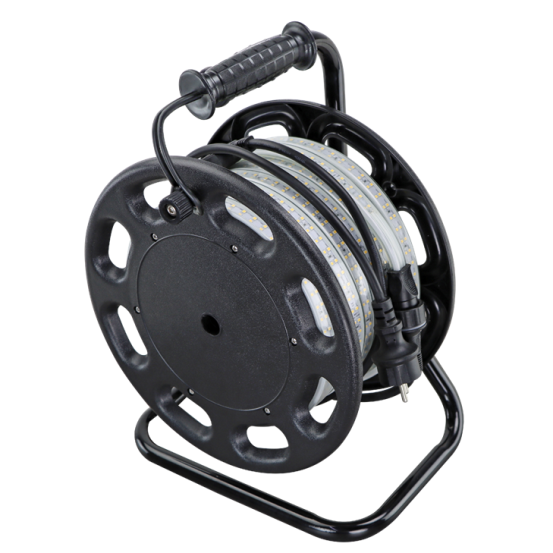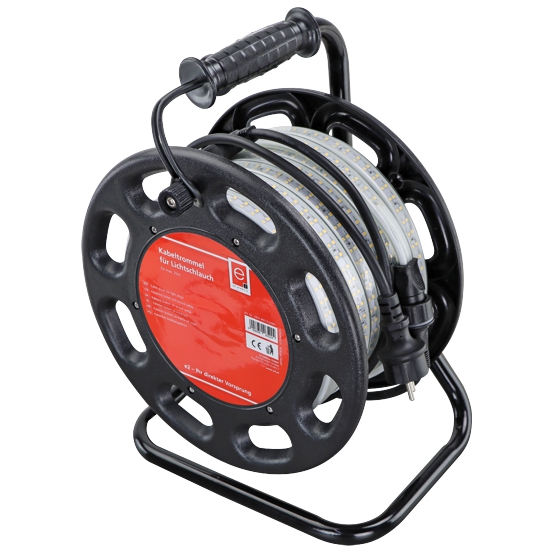 Robuste Trommel mit Standfüßen und Handgriff für eine ordentliche und platzsparendere Lagerung des LED Lichtschlauchs, geeignet für max. 25m Lichtschlauch;