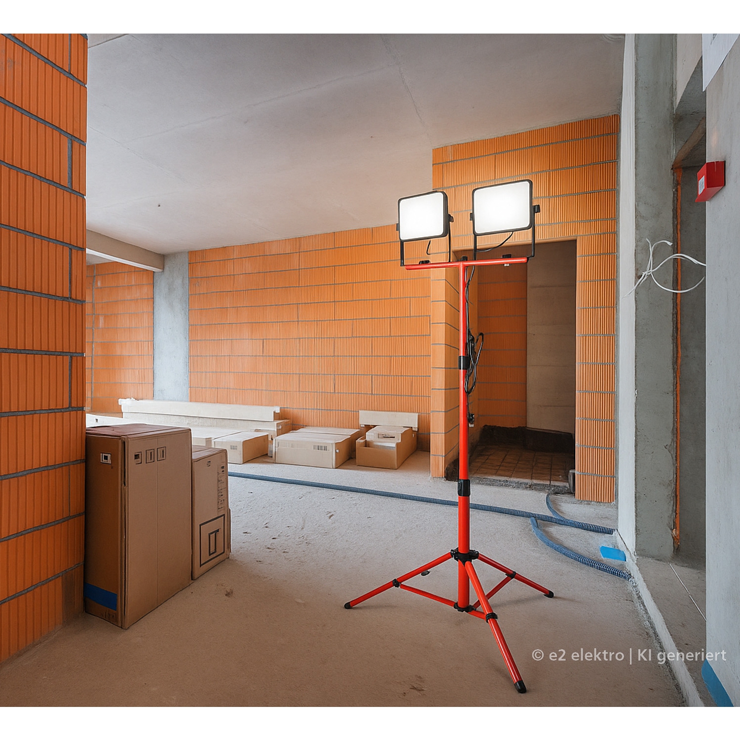 Robuste Baustrahler mit Teleskop-Stativ 1,5m, Anschlusskabel 3m, Strahler dreh- und schwenkbar, Gehäuse: Aluminium-Druckguss, Abdeckung: Polycarbonat, Stativ: Stahl, Schutzart: IP65;