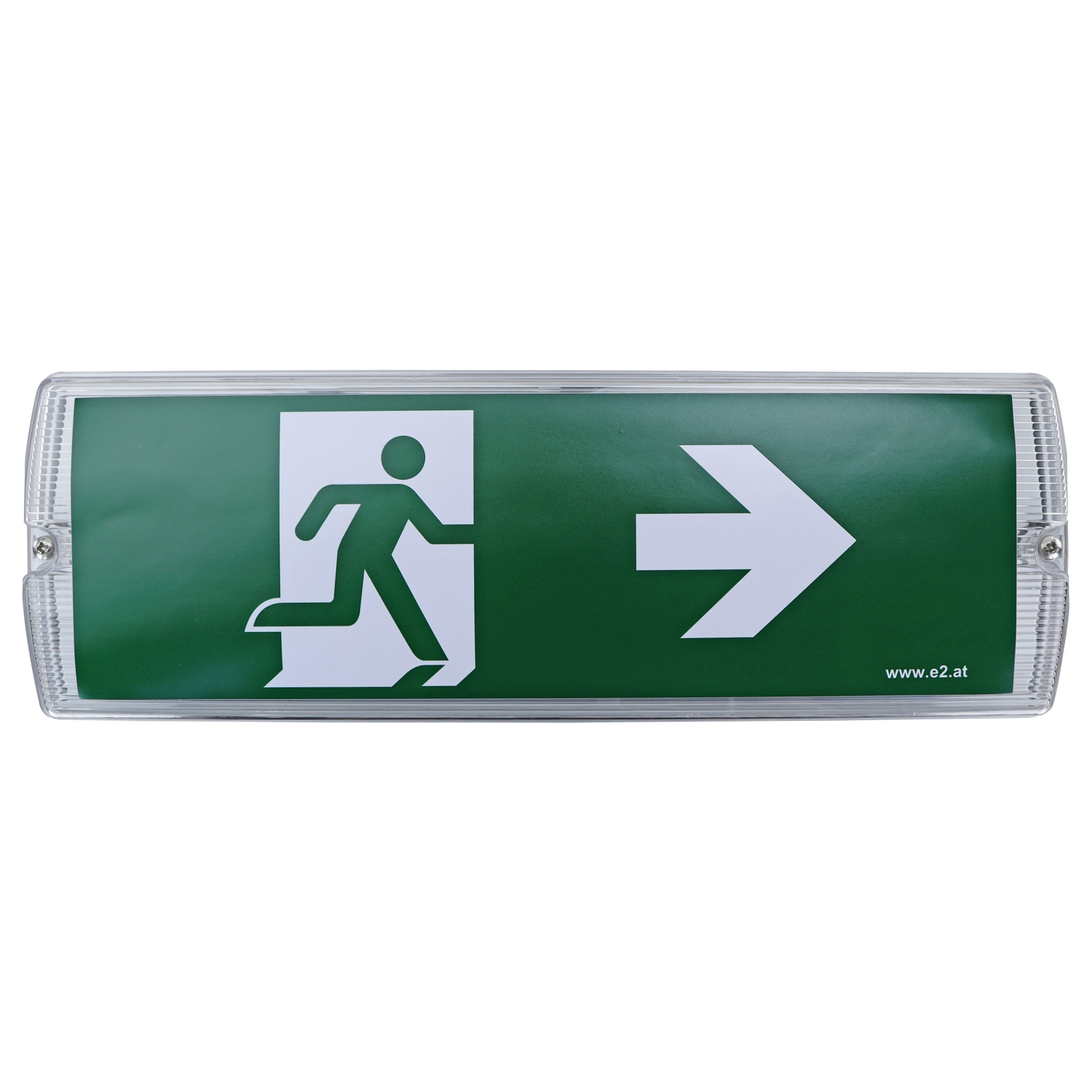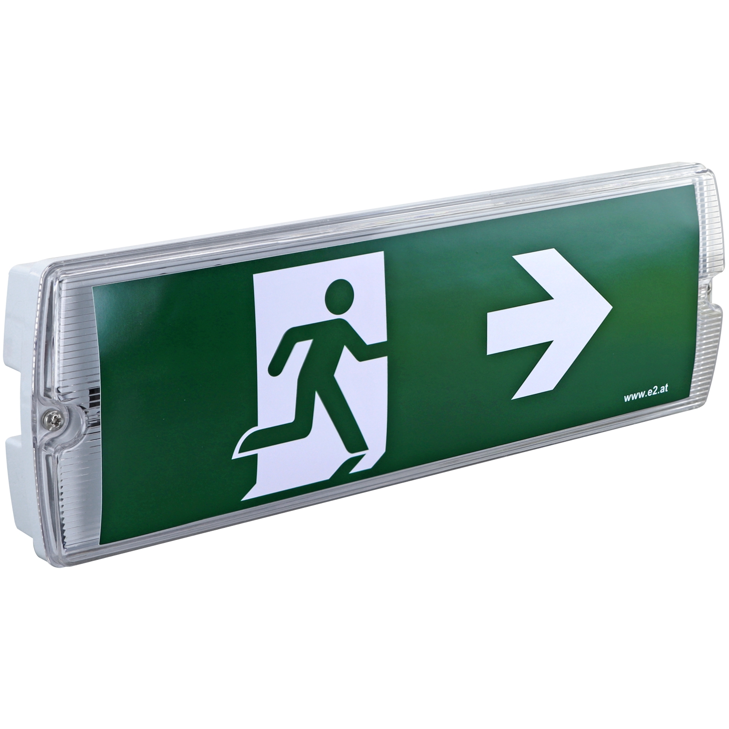 Rettungszeichen- / Sicherheitsleuchte mit 3 Std. Überbrückungszeitzeit, Autotestfunktion, Erkennungsweite 22 Meter, Dauer/Bereitschaft anschließbar, Abdeckung und Grundkörper aus schlagfestem Polycarbonat, Piktogramme sind im Lieferumfang enthalten, IP65