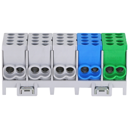 Hauptleitungsklemmblock 5polig wartungsfrei, geeignet für Kupfer- und Aluminiumleiter, Nennstrom: 130/100A, Klemmbereich: 1.5mm² bis 25mm², 4 Anschlüsse pro Pol, Schnellmontage auf Hutschiene;