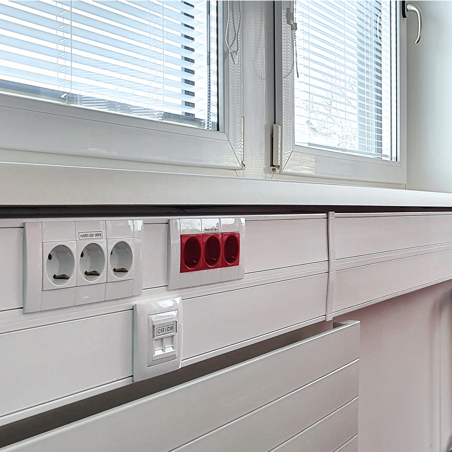 Brüstungskanal aus Kunststoff inkl. Deckel, Material: PVC, Farbe reinweiß ähnlich RAL 9003, für den Einbau von Schalt- und Steckgeräten, Schlagfestigkeitsklasse IK08, geprüft nach EN 50085-2-1, IP44;