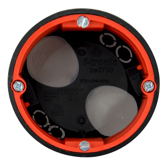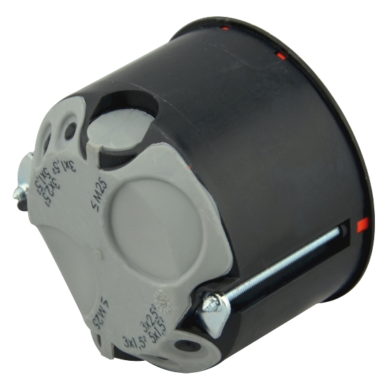 Brandschutzdose mit Durchstoßmembran, Fräsloch 68mm, anreihbar, Material hochfester und temperaturbeständiger Spezialkunststoff, Feuerwiderstandsklasse bis EI 120, Einführungen: Durchstoßmembran 2x ≤M25/ 2x Kabel (3x1,5mm²)/ 2x Kabel (3x2,5mm²/5x1,5mm²), IP30, halogenfrei;