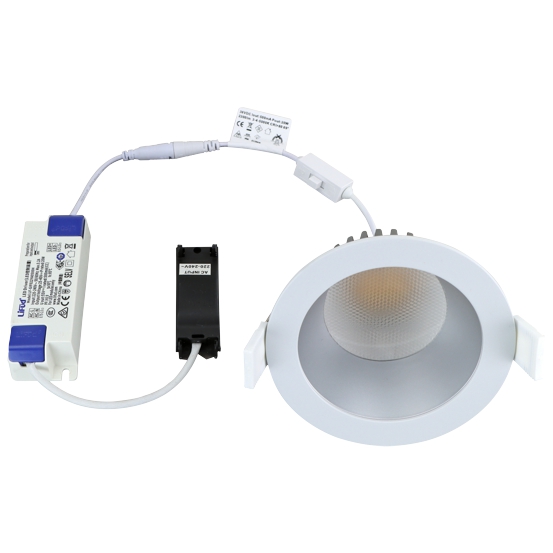 Einbau-Downlight, Lichtfarbe einstellbar (CCT - 3000/4000/6000K), Anschluss: 220-240V AC 50Hz, UGR≤19, CRI>80, Lebensdauer: 50.000h, Schutzklasse II, Schutzart IP65, nicht dimmbar, Gehäuse und Rerflektor aus Aluminium, Abdeckung aus Polycarbonat, Temperaturbereich: -15°C bis +35°C, Ausschnittmaß Ø120-130mm, Einbautiefe 75mm;
