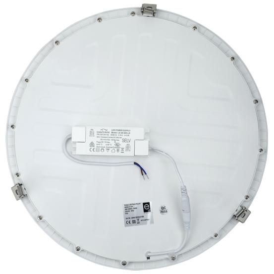 Einbau LED Panel mit weißem Aluminiumrahmen, Ausschnittmaß Ø380mm, Einbautiefe 35mm, Rückseite aus Stahlblech, Klappfedermontage, Abdeckung Acrylglas opal, 3000K, durchschnittliche LED Lebensdauer 30.000h, Temperaturbereich: -15°C bis +40°C, Anschlussspannung 230VAC, inkl. LED Treiber, SK II, IP20;