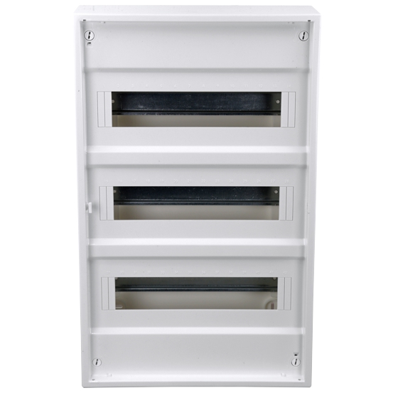 Aufputz-Verteiler aus Kunststoff ohne Tür, 3x12(14)TE, IP20 (IP40 mit optional erhältlicher Tür), Bemessungsspannung: 400V, Bemessungsstrom: 63A, Material: Kunststoff, Glühdrahttest: 650°C, inkl. Klemm-Material, Anzahl der PE/N Anschlüsse: 10/10;