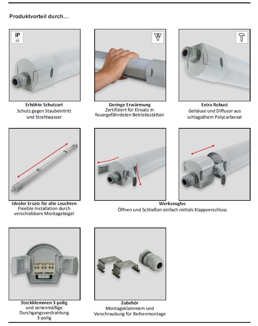 4000K, 220-240V AC 50Hz, SK I, Steckklemmen 3-polig bis 2,5mm², EasyCON Anschlusstechnik - kein zerlegen der Leuchte erforderlich, 3-polige Durchgangsverdrahtung (max. 30 Stk in Serie), IP65, Temperaturbereich: -15°C bis +50°C, Abstrahlwinkel: 120°, CRI>80, LED fix verbaut - Austausch nicht möglich, nicht dimmbar, 50.000h, Gehäuse und Abdeckung aus Polycarbonat (PC) UV-beständig, schwer entflammbar, Montageklammern aus INOX