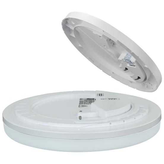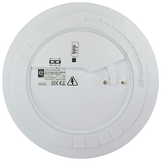 LED Anbauleuchte mit wechsel- bzw. austauschbarer Leuchteinheit, Beim Tausch der Leuchteinheit ist kein elektrischer Anschluss bzw. keine Demontage der gesamten Leuchte erforderlich, Befestigung der Leuchteinheit (Abdeckung) einfach mittels Bajonettverschluss, Schutzart IP54, SK II, Farbtemperatur umschaltbar 3000/4000/6500K, 220-240V 50Hz, Lichtleistung 3-stufig einstellbar 18W/15W/12W - 2400lm bei 18W, Montageplatte mit 2-facher Kabeleinführung, Kunststoff-Gehäuse (PC - halogenfrei) weiß, schlaghemmende Abdeckung aus Kunststoff opal (PC - halogenfrei), UV-beständig, CRI=87, Abstrahlwinkel 118°, nicht dimmbar, Temperaturbereich - 15°C bis +35°C