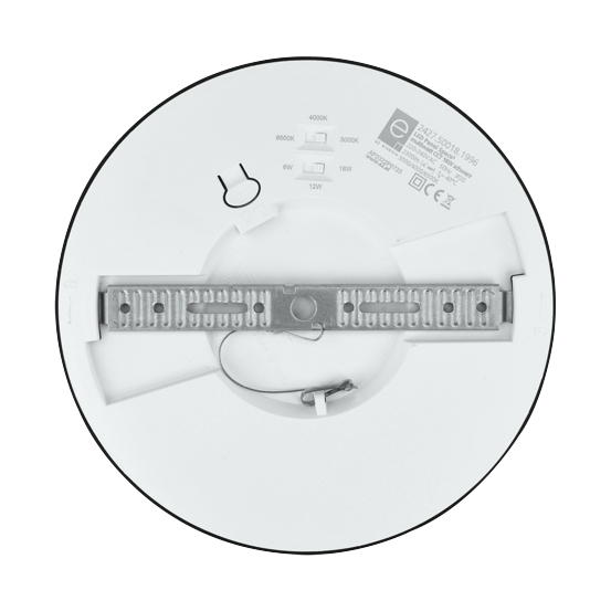 LED Panel mit flexiblem Montagebügel zur Anbau- oder Einbaumontage mit Klappfedern in Ausschnitt Ø65-210mm, schwarzer Kunststoffrahmen, Gehäuse aus Polypropylen, Abdeckung opal, Lichtleistung 3-stufig einstellbar 18W/12W/6W, 2300lm bei 18W, Lichtfarbe 3000/4000/6500K an Gehäuserückseite umschaltbar, inkl. LED Treiber, durchschnittliche LED Lebensdauer 25.000h, CRI>80, Abstrahlwinkel 117°, nicht dimmbar, Schutzart IP20, SK II, 220-240V 50Hz, Temperaturbereich: -10°C bis +40°C;