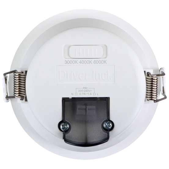 Einbau-Downlight, Lichtfarbe einstellbar (CCT - 3000/4000/6000K), dimmbar, Anschluss: 220-240V AC 50Hz, UGR≤19, CRI=85, Lebensdauer: 50.000h, Schutzklasse II, Schutzart IP44, Gehäuse aus Kunststoff, Reflektor und Kühlteil aus Aluminium, Temperaturbereich: -20°C bis +40°C, Ausschnittmaß Ø90-95mm, Einbautiefe 91mm;