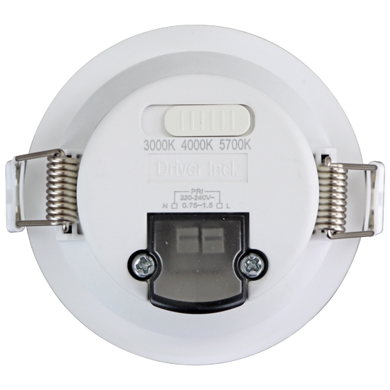 Einbau-Downlight, Lichtfarbe einstellbar (CCT - 3000/4000/6000K), dimmbar, Anschluss: 220-240V AC 50Hz, UGR≤19, CRI=85, Lebensdauer: 50.000h, Schutzklasse II, Schutzart IP44, Gehäuse aus Kunststoff, Reflektor und Kühlteil aus Aluminium, Temperaturbereich: -20°C bis +40°C, Ausschnittmaß Ø120-128mm, Einbautiefe 102mm;
