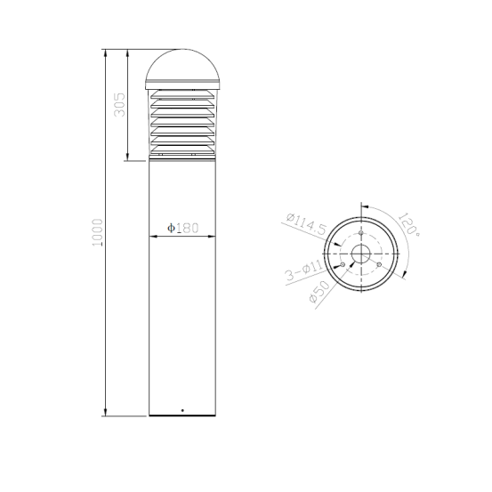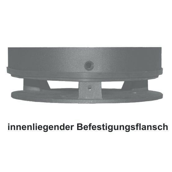 Pollerleuchte aus Aluminium pulverbeschichtet, innenliegender Bodenflansch mit seitlicher Befestigung des Pollers, Abdeckung aus Polycarbonat transparent, innenliegender nach unten gerichteter Reflektor, ideal zur Bestückung mit E27 LED-Lampe, Schlagfestigkeit: IK08, IP65;