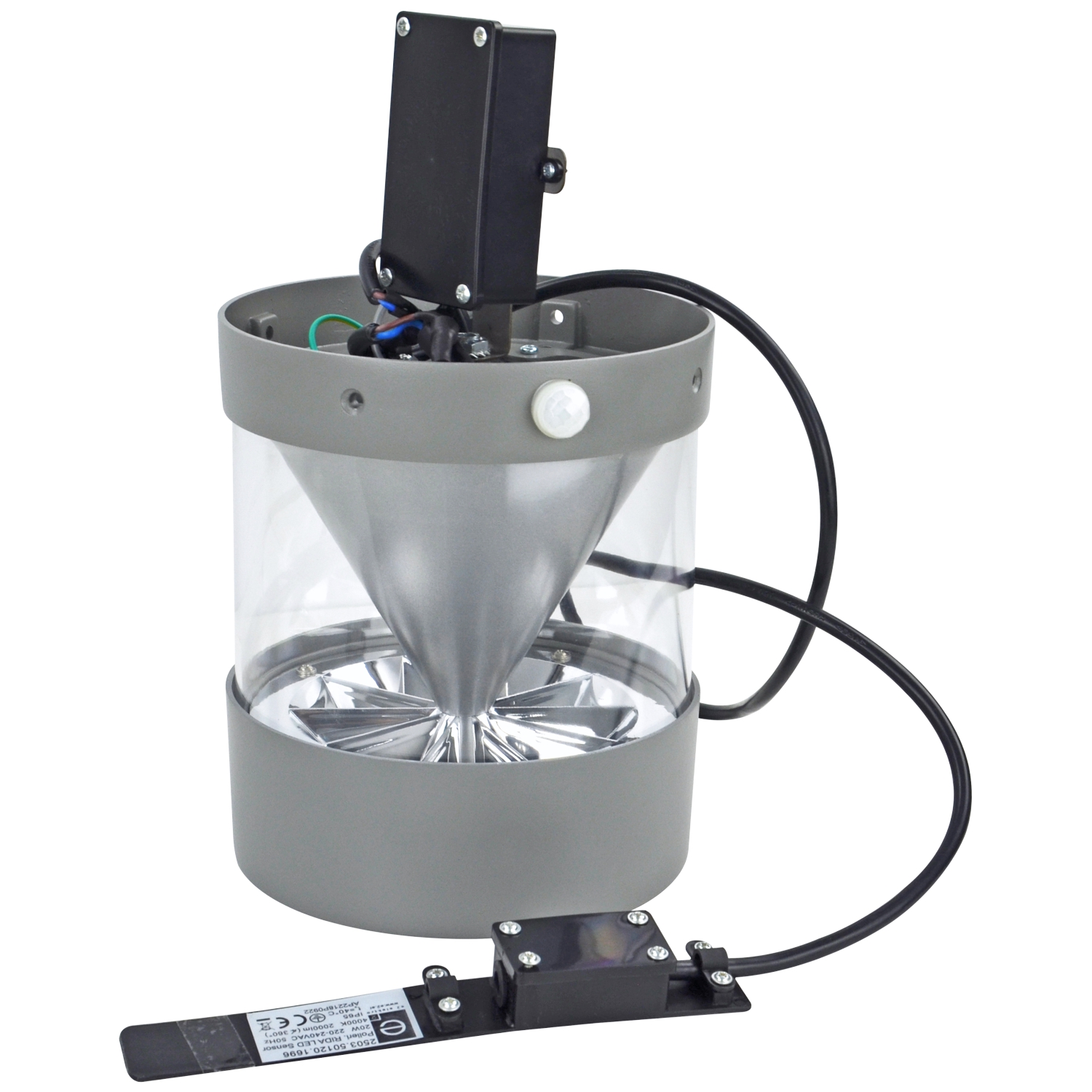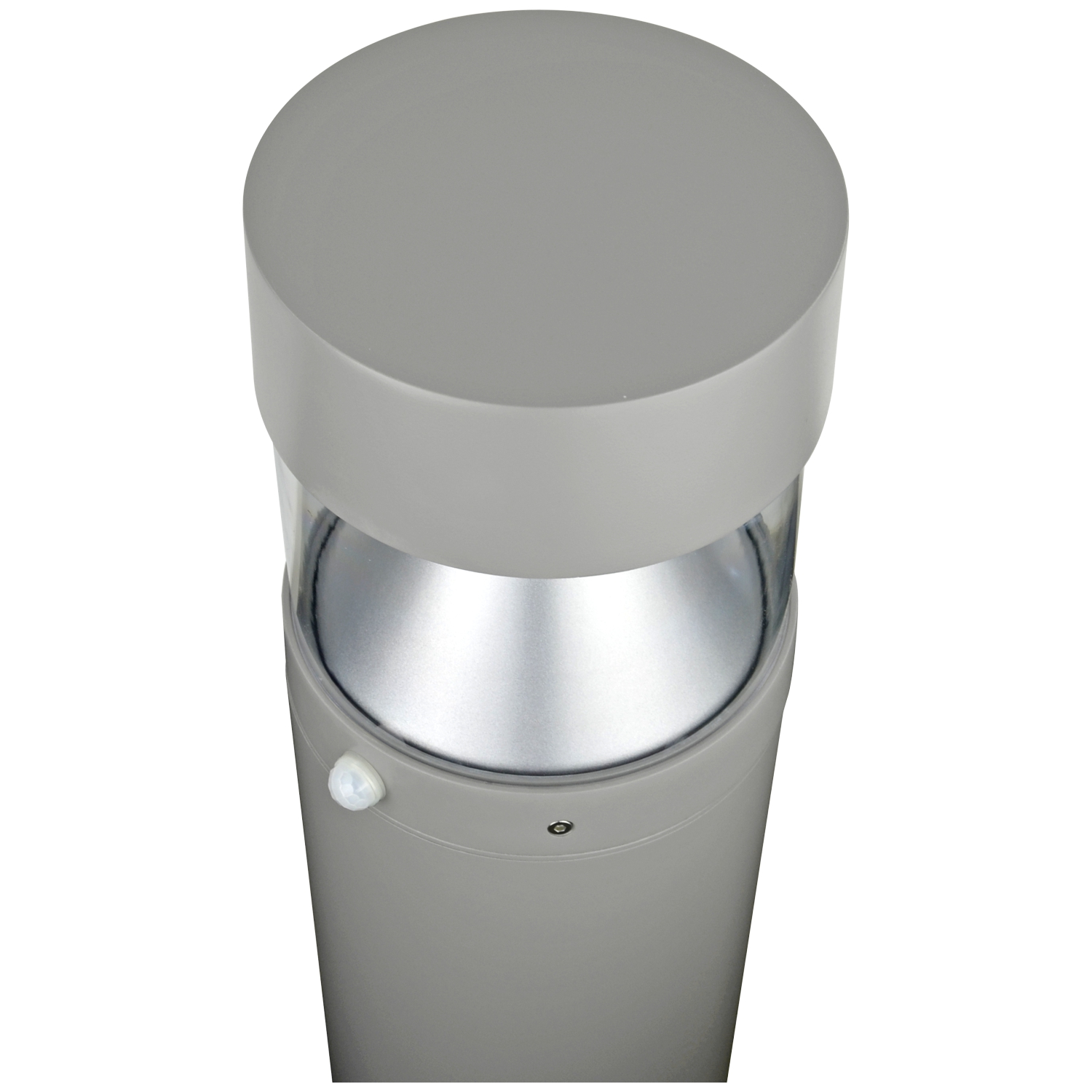 Pollerleuchte mit Infrarot Sensor, aus Aluminium, pulverbeschichtet, innenliegender Bodenflansch mit seitlicher Befestigung des Pollers, Abdeckung aus Polycarbonat transparent, innenliegender nach unten gerichteter Diffusor aus Edelstahl, 4000K, Lebensdauer Ø30.000 Stunden, IP65, IK08, Sensor: Erfassungsbereich: 90°, Reichweite: bis 4m, Zeiteinstellung: 5 Sek. bis 8 Min., Dämmerungsschwelle: ≤30Lux;