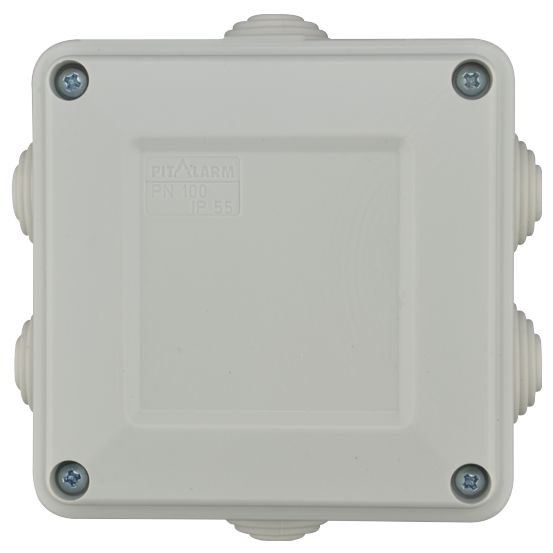 Halogenfreier Aufputz-Abzweigkasten mit 6 konischen Einführungen, Deckel verschraubt, Farbe grau RAL 7035;