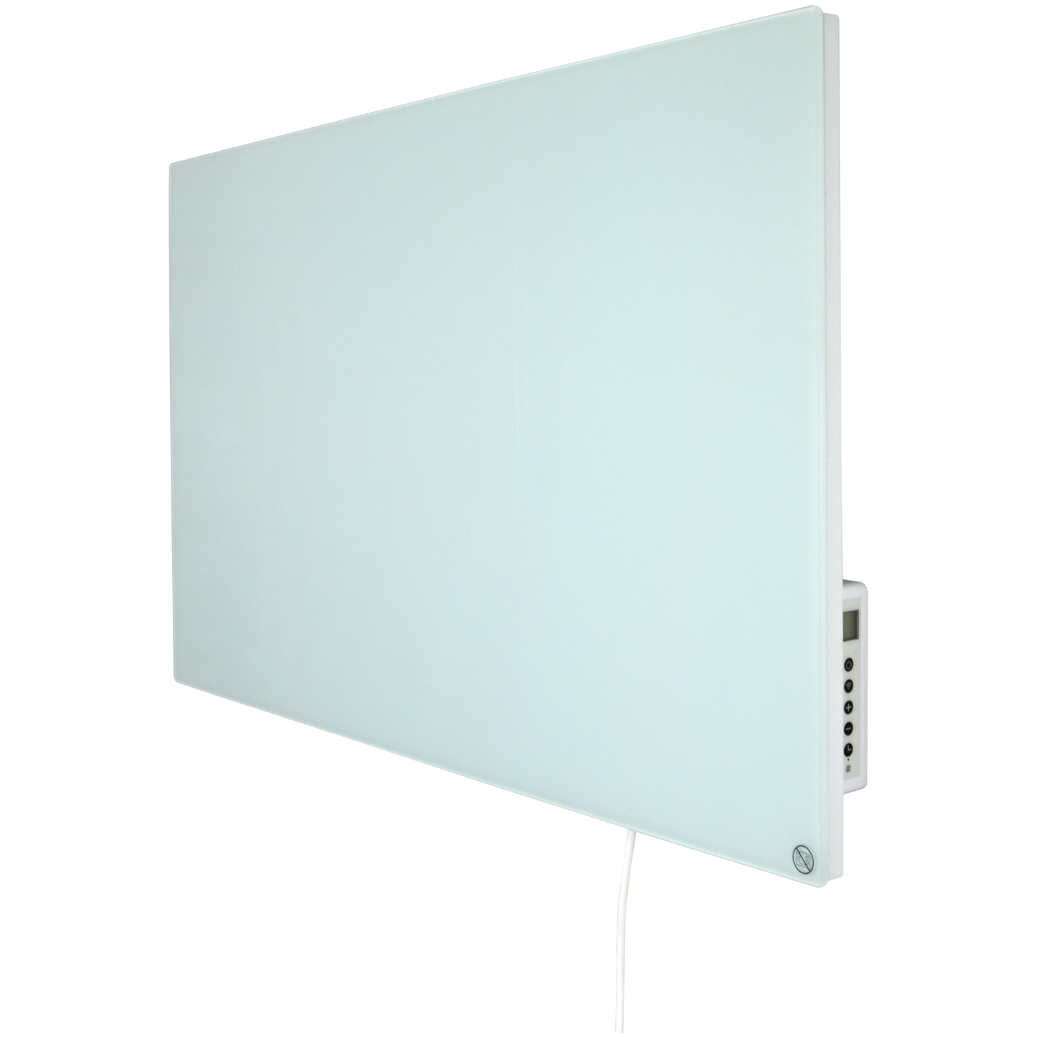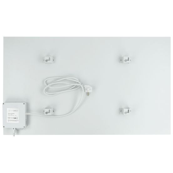 Infrarot-Heizpaneel mit integrierter Temperatursteuerung, Vorderseite aus Milchglas, Fernbedienung und WiFi Schnittstelle (regelbar über TUYA-App), Heizelement aus Carbon crystal für Räume von 5-10m² (unverbindlicher Orientierungswert: basierend auf Raumhöhe 2,50m und Dämmung nach heutigem Standard), mit Überhitzungsschutz, 1.6m Anschlussleitung mit Stecker, Anschluss 220-240V AC 50Hz, IP44, Lebensdauer: 100.000Std., inkl. Montagematerial und Standfüße, Montage an Wand oder freistehend, bei freistehender Montage mit Standfüßen ist das Heizpaneel gegen Kippen zu sichern;Dieses Produkt ist nur für gut isolierte Räume oder für den gelegentlichen Gebrauch geeignet.