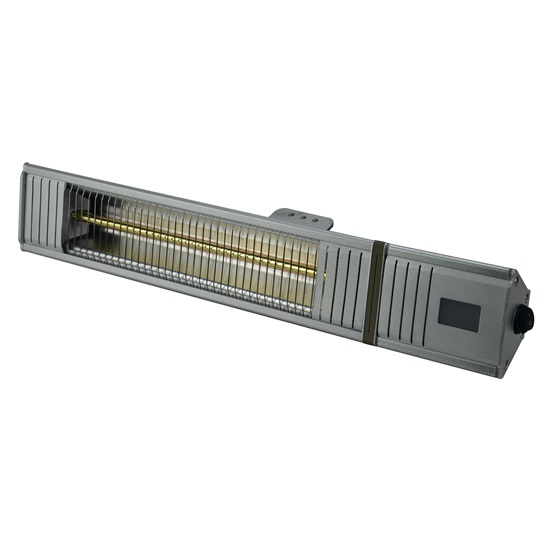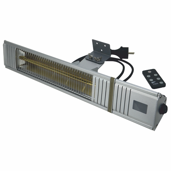 Infrarot-Heizstrahler 2000W zur Wandmontage, Heizelement Goldröhre mit ca. 5.000h Lebensdauer, 9 Heizstufen, Fernbedienung mit Timer-Funktion (5-95min), Gehäuse aus Aluminium, Aluminium-Reflektor, 1,6m Anschlussleitung mit Stecker, Anschluss 220-240V AC 50Hz, IP65, Gewicht: 1,5kg, inkl. Montagebügel und Montagematerial, -15°C bis +35°C, Steuerung von mehreren Heizstrahlern mit einer Fernbedienung möglich;