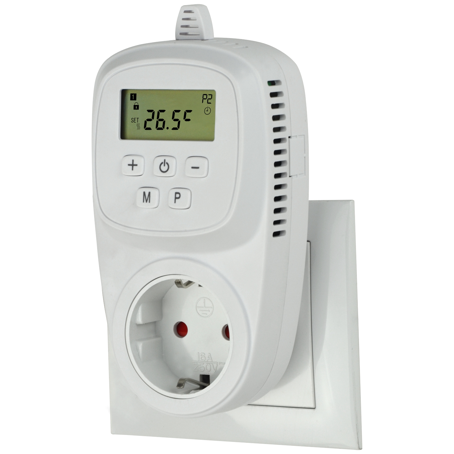Steckdose mit integriertem digitalem Thermostat, Spannung 230V AC, Relais max. 16A, einstellbarer Temperaturbereich +5°C bis +35°C (0.5°C), Frostschutzfunktion(+5 bis +10°C einstellbar), Bediensperre, Messgenauigkeit ±0.5°C, Schutzart IP20, Arbeitstemperatur 0°C bis +50°C;