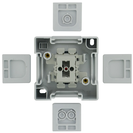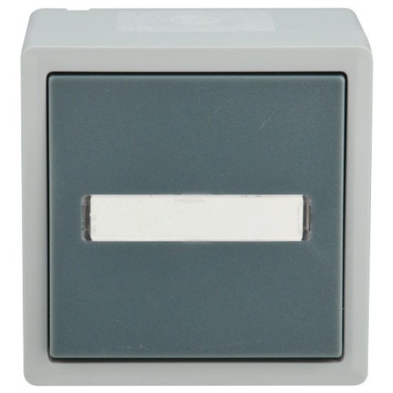 Feuchtraum-Aufputz Taster VARIO21, 1-polig Schließer, Beschriftungsfeld, serienmäßig mit roter LED beleuchtet, Material Polycarbonat, Halogen- und PVC-frei, hellgrau/dunkelgrau, Temperaturbereich -30 bis +70°C, 4 Kabeleinführungen, schlagfest IK10, IP44, 10A, 250VAC