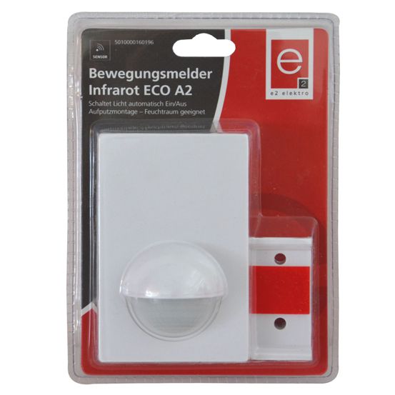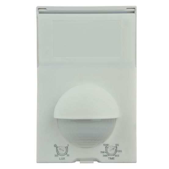 Aufputz Bewegungsmelder für Wandmontage, Erfassungswinkel 180º, Reichweite: bis 12m Radius bei Montagehöhe 2,5m, Ausschaltverzögerung: 10 Sek. bis 15 Min., Dämmerungsschwelle stufenlos einstellbar (3-2000Lux), Schaltleistungen: 1200W ohmsche Last / 300W induktive Last / 80W LED, Temperaturbereich: -20°C bis +40°C, IP44;