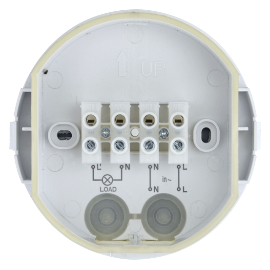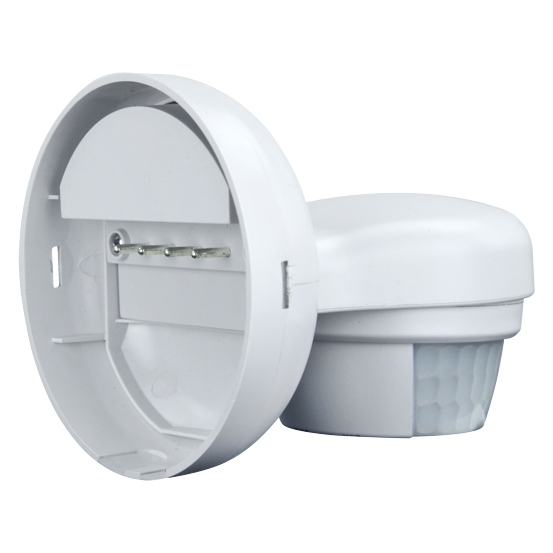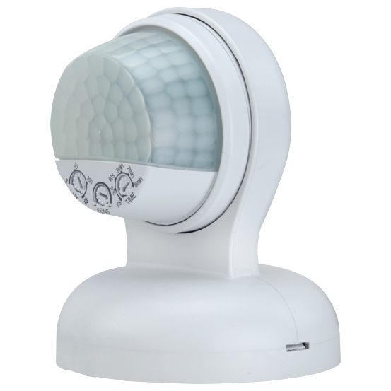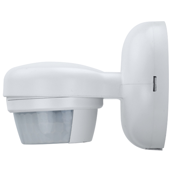 Aufputz Bewegungsmelder für Wandmontage, Erfassungswinkel 240°, Reichweite: bis 14m Radius, Ausschaltverzögerung: 10 Sek. bis 15 Min., Dämmerungsschwelle stufenlos einstellbar (3-2000Lux), Schaltleistungen: 1200W ohmsche Last / 600W elektronische Last / 600W LED, IP65;
