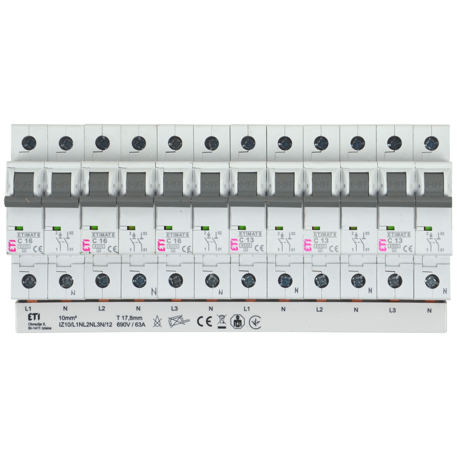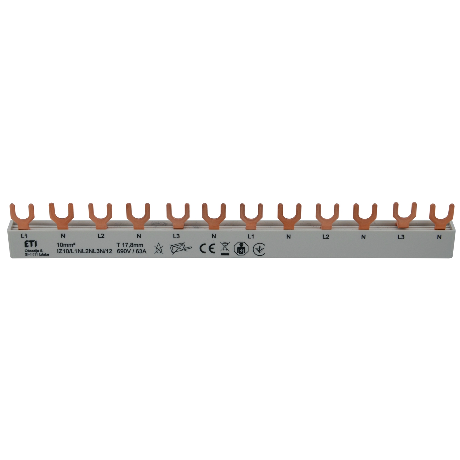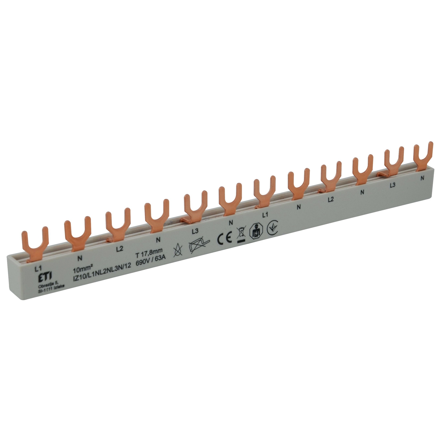 Vorkonfektionierte Gabel-Sammelschiene inkl. Endkappen, 4-polig / 12 TE (L1 - N - L2 - N - L3 - N - L1 - N - L2 - N - L3 - N), Querschnitt: 10mm², passend zum PXE und ETI Programm