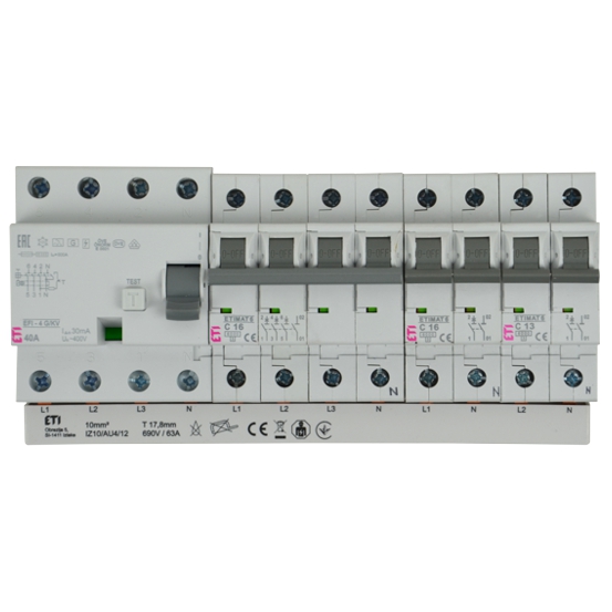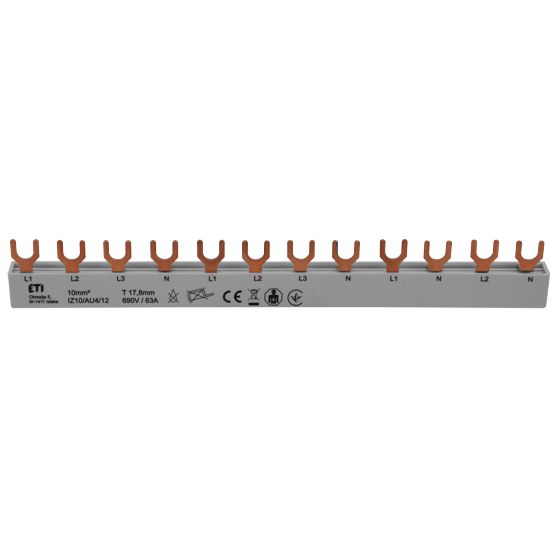 Vorkonfektionierte Gabel-Sammelschiene inkl. Endkappen, 4-polig / 12 TE (L1 - L2 - L3 - N - L1 - L2 - L3 - N - L1 - N - L2 - N), Querschnitt: 10mm²;