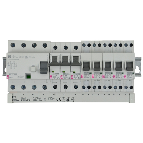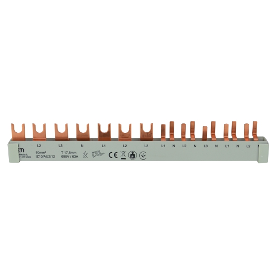 Vorkonfektionierte Gabel-Sammelschiene inkl. Endkappen, 4-polig / 12 TE (L1 - L2 - L3 - N - L1 - L2 - L3 - L1/N - L2/N - L3/N - L1/N - L2/N), Querschnitt: 10mm², passend zum ETI Programm;