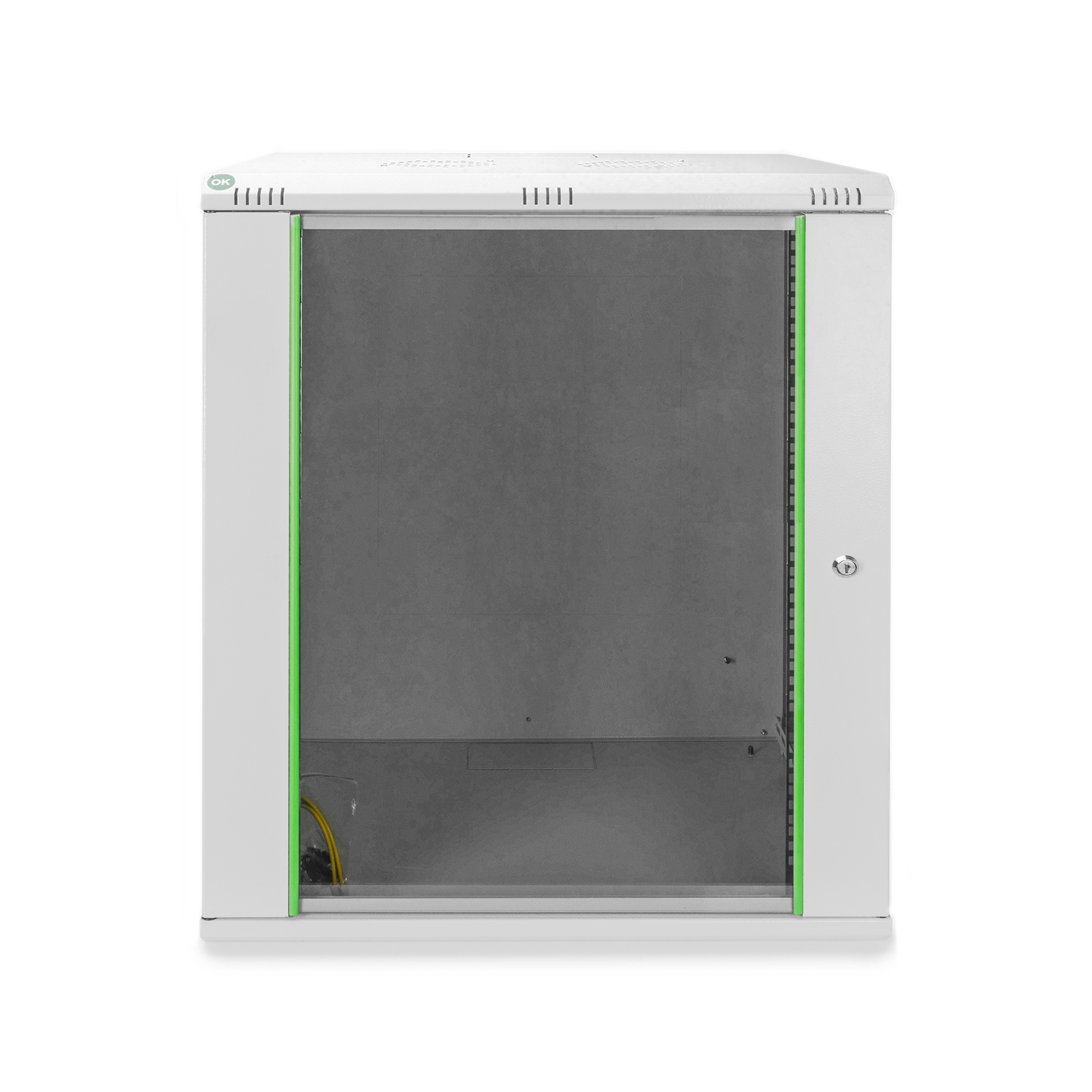19" Wandgehäuse, Material: Stahlblech pulverbeschichtet, 483 mm (19") Profilschienen an der Vorder- und Rückseite tiefenvariabel, abschließbare Sicherheitsglastür, Kabelzuführung von oben, unten und hinten, Lüftungsschlitze für aktive sowie passive Be- und Entlüftung, Seitenteile abnehmbar, 4 Erdungspunkte (Boden, Seitenteil und Fronttür), Eigengewicht 24.2kg, IP20;