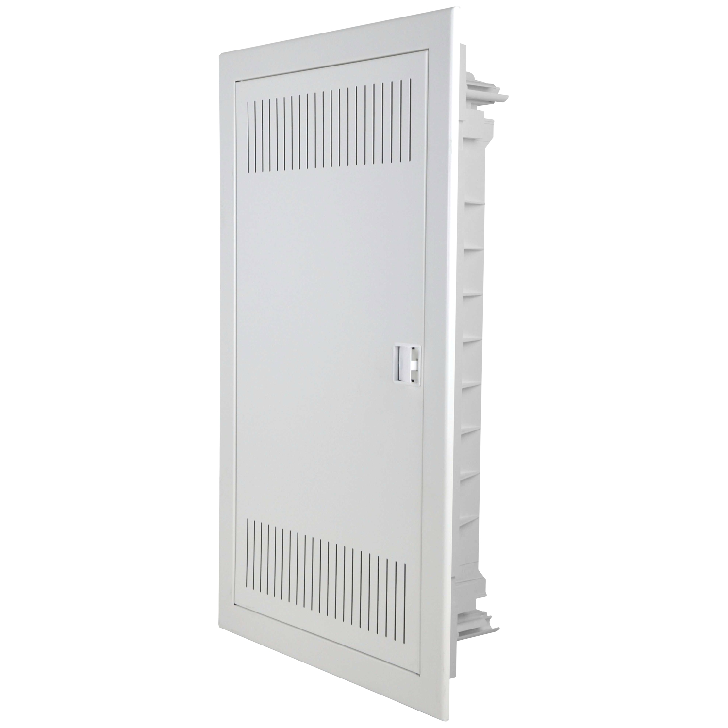Unterputz-Mediaverteiler zur Montage in Wände aller Art, bestehend aus Unterteil (Mauerwanne) und Oberteil (Rahmen und Tür), perforierte Tür aus Stahlblech, Mauerwanne aus Kunststoff, Montagelochplatte, inkl. Hohlwand-Montagesatz, Nischenmaß: 306x549x87mm, halogenfrei;