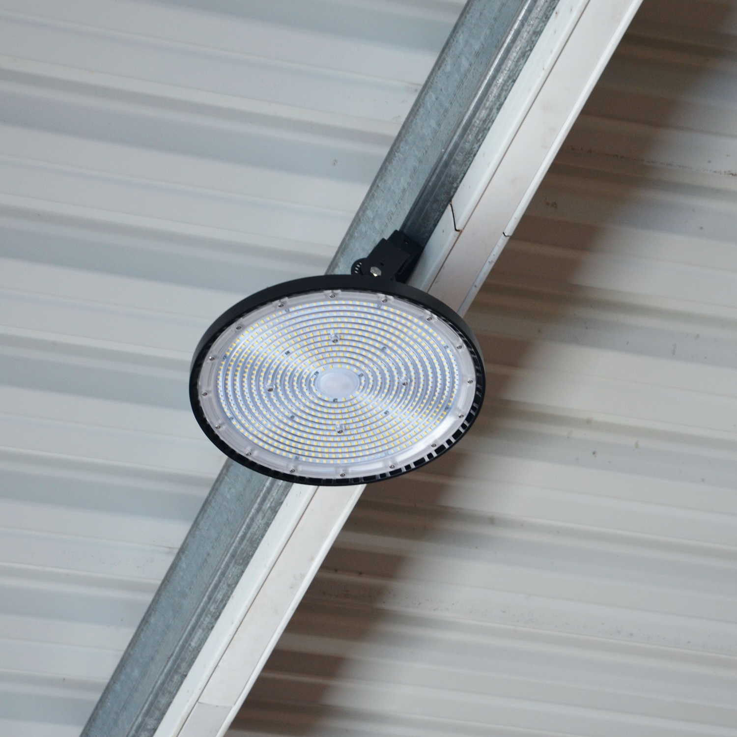 Hallenleuchte aus Aluminium-Druckguss, PC Abdeckung, Schutzart IP65, SK I, 6000K, Anschluss: 220-240V 50Hz, CRI=85, Abstrahlwinkel 115°, DALI-dimmbar, Temperaturbereich - 20°C bis + 40°C , LED Lebensdauer 50.000 Stunden, inkl. Kette mit Karabiner (l: 60cm) zur Abhängung;
