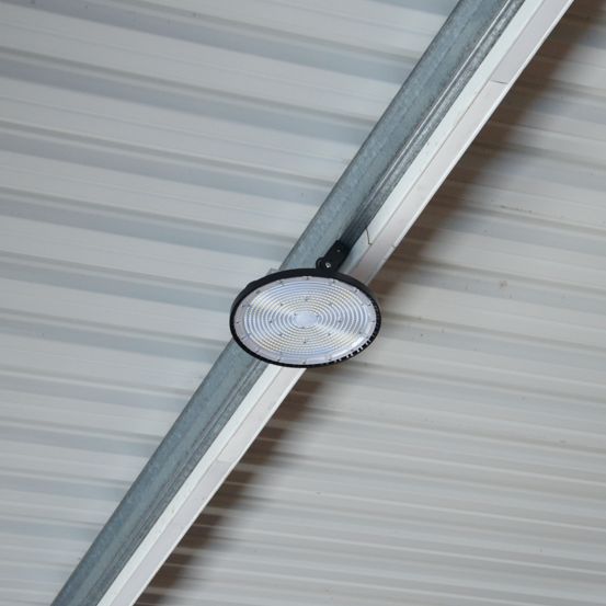 LED Hallenleuchte aus Aluminium-Druckguss, PC Abdeckung, Schutzart IP65, SK I, 6000K, Anschluss: 220-240V 50Hz, CRI=85, Abstrahlwinkel 115°, DALI-dimmbar, Temperaturbereich - 20°C bis + 40°C , LED Lebensdauer 50.000 Stunden, inkl. Kette mit Karabiner (l: 60cm) zur Abhängung;
