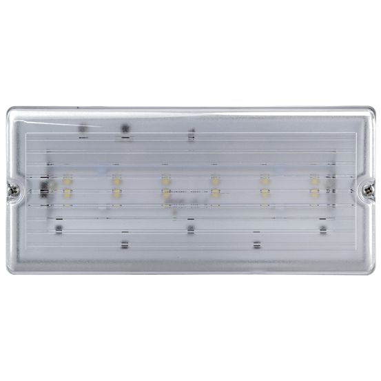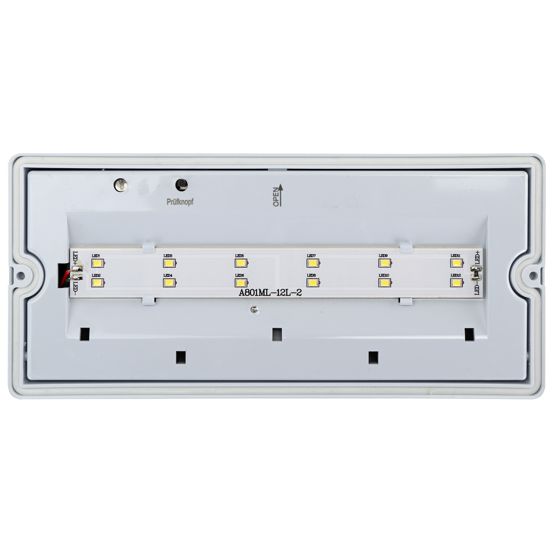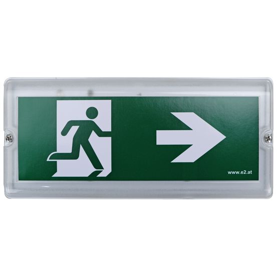 Rettungszeichen- / Sicherheitsleuchte mit 3 Std. Überbrückungszeitzeit, Autotestfunktion, Erkennungsweite 12 Meter, Dauer/Bereitschaft anschließbar, Abdeckung und Grundkörper aus schlagfestem Polycarbonat, Piktogramme sind im Lieferumfang enthalten, IP65