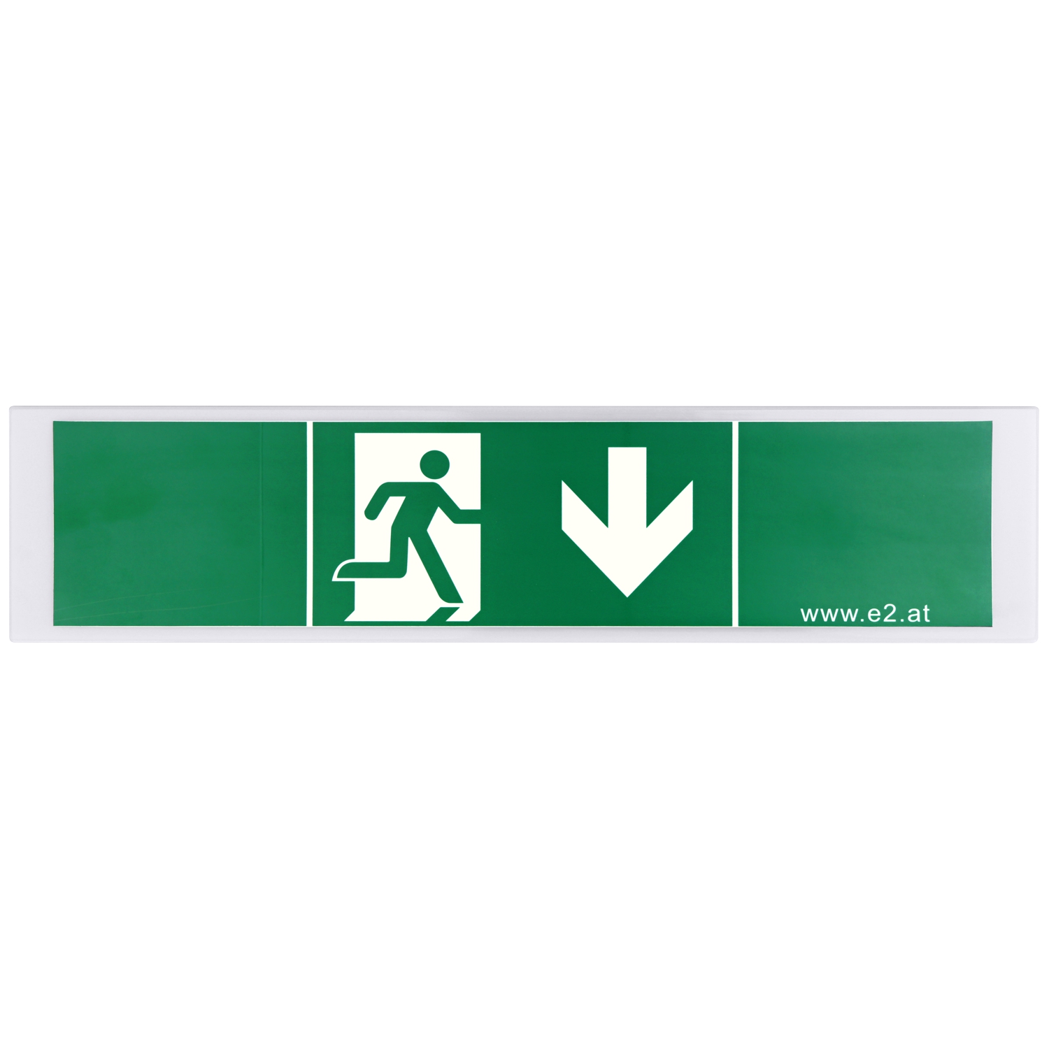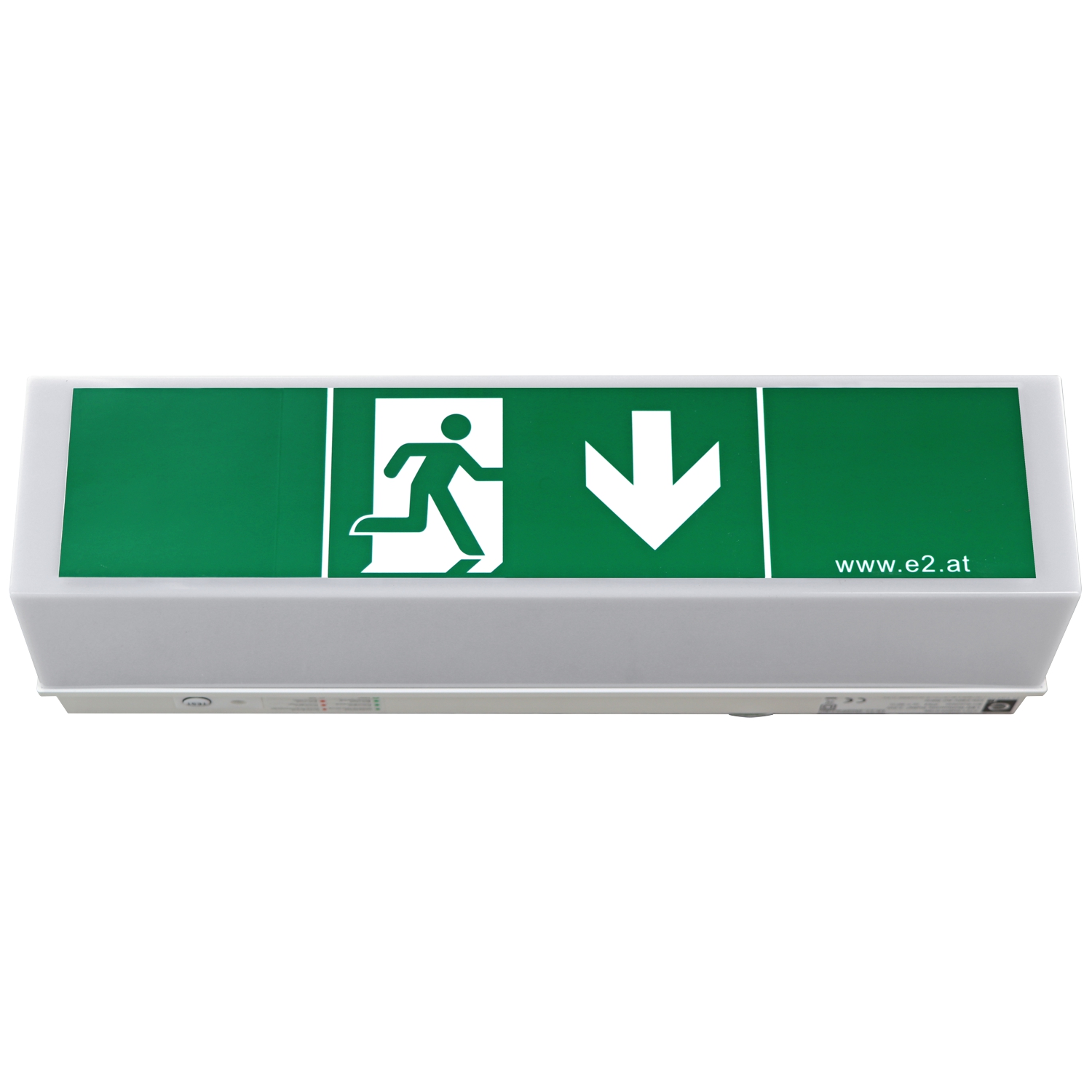 Rettungszeichen- / Sicherheitsleuchte mit einstellbarer Überbrückungszeitzeit 1, 2, 3 oder 8 Std., Wand- und Deckenmontage, Erkennungsweite 14 Meter, Dauer/Bereitschaft einstellbar, Abdeckung und Grundkörper aus schlagfestem Polycarbonat, Piktogramme (beigelegt) - sehr einfache Montage, IP54;