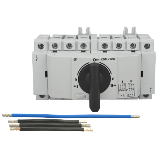 Manueller Umschalter für Reiheneinbau nach IEC 60947-3, zur Umschaltung von Netzbetrieb auf Notstromversorgung (Notstromaggregat, Photovoltaik mit Speicher), inkl. Drahtbrücken 6mm² (3x Schwarz und 1x blau);